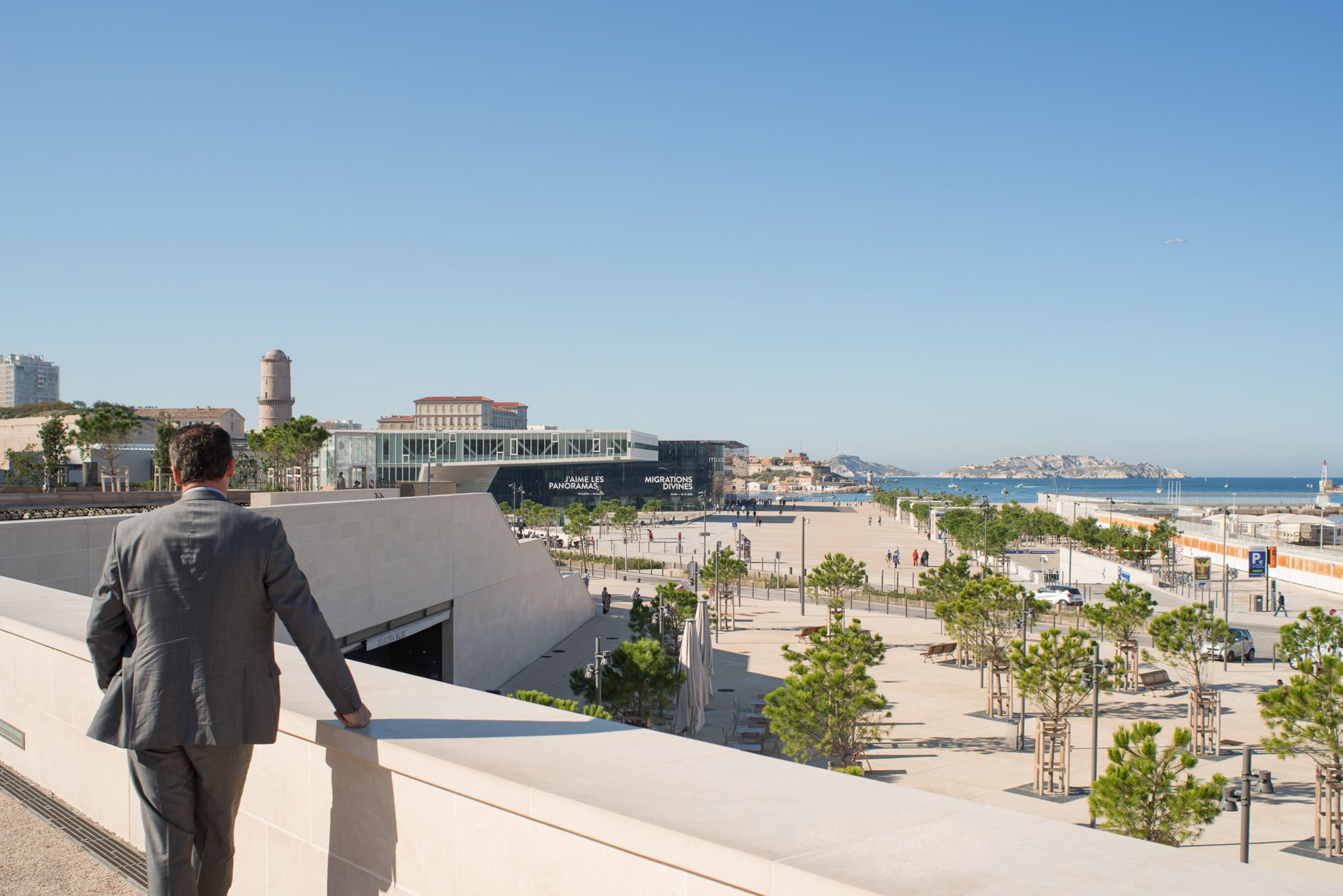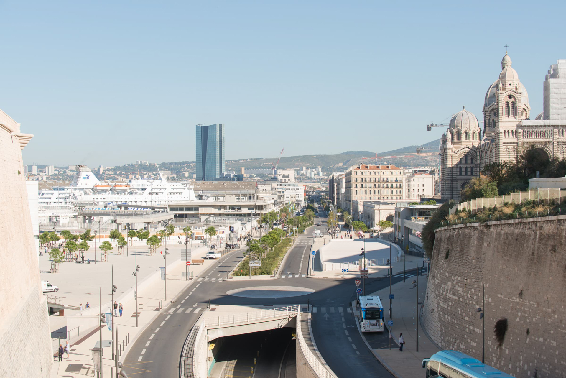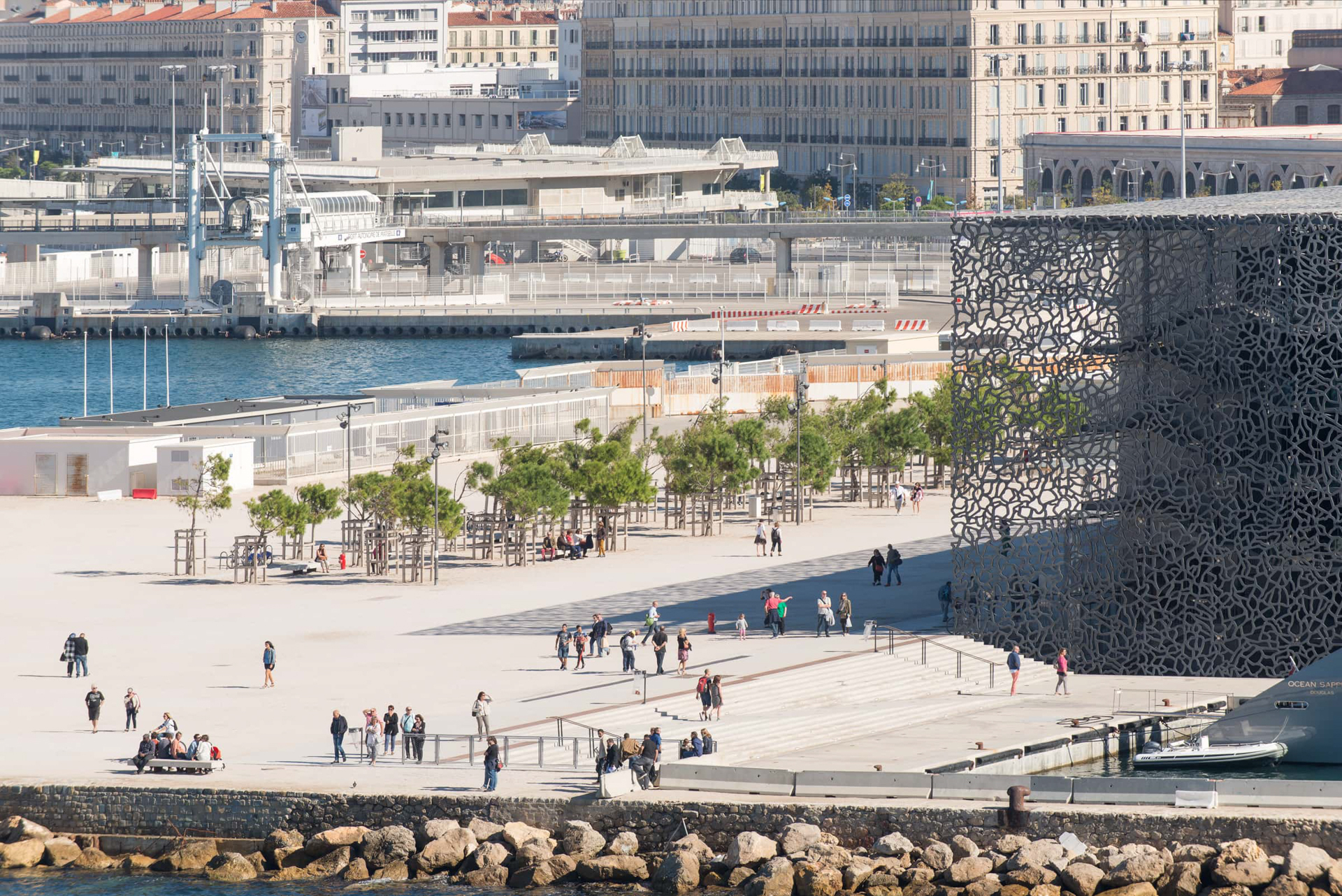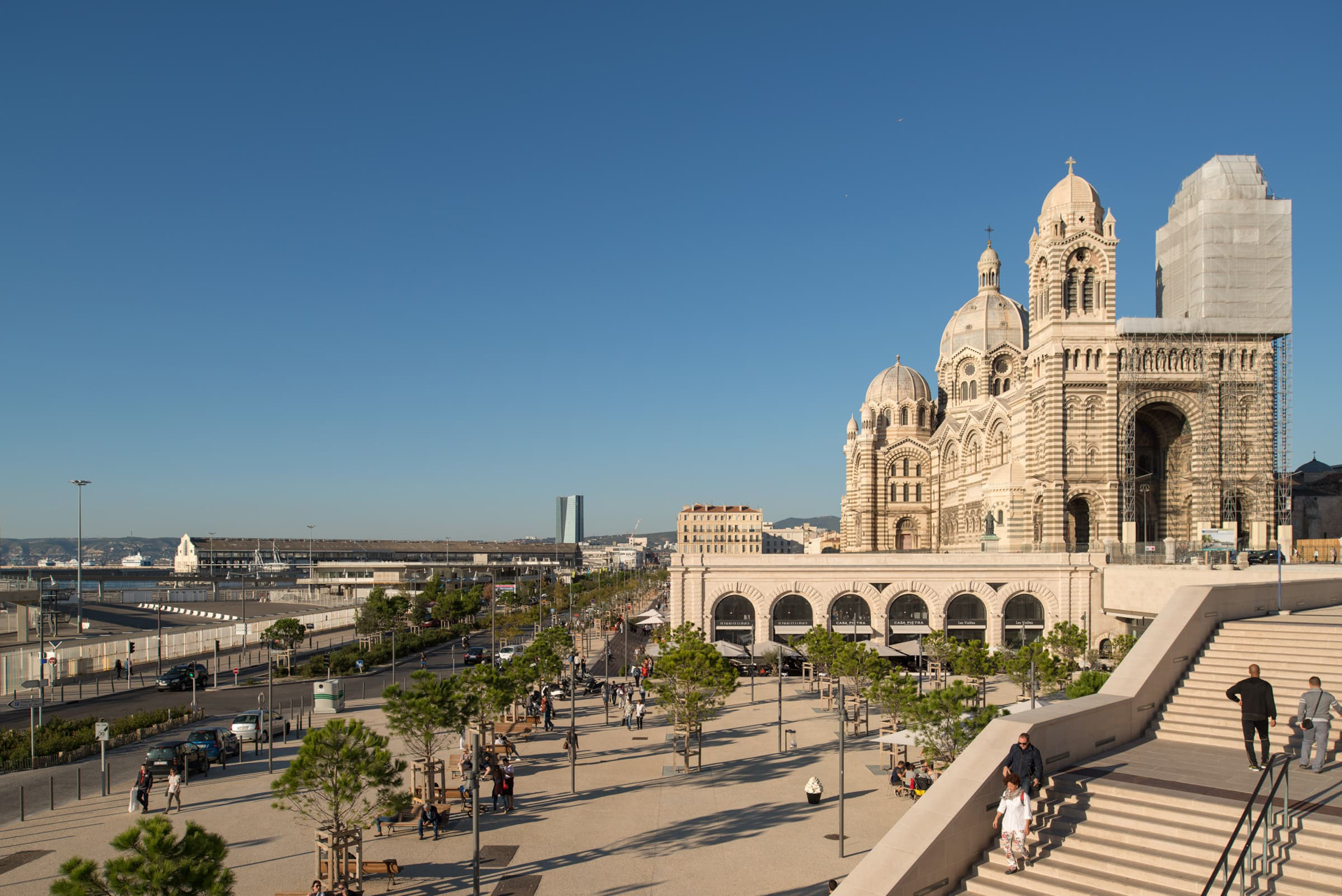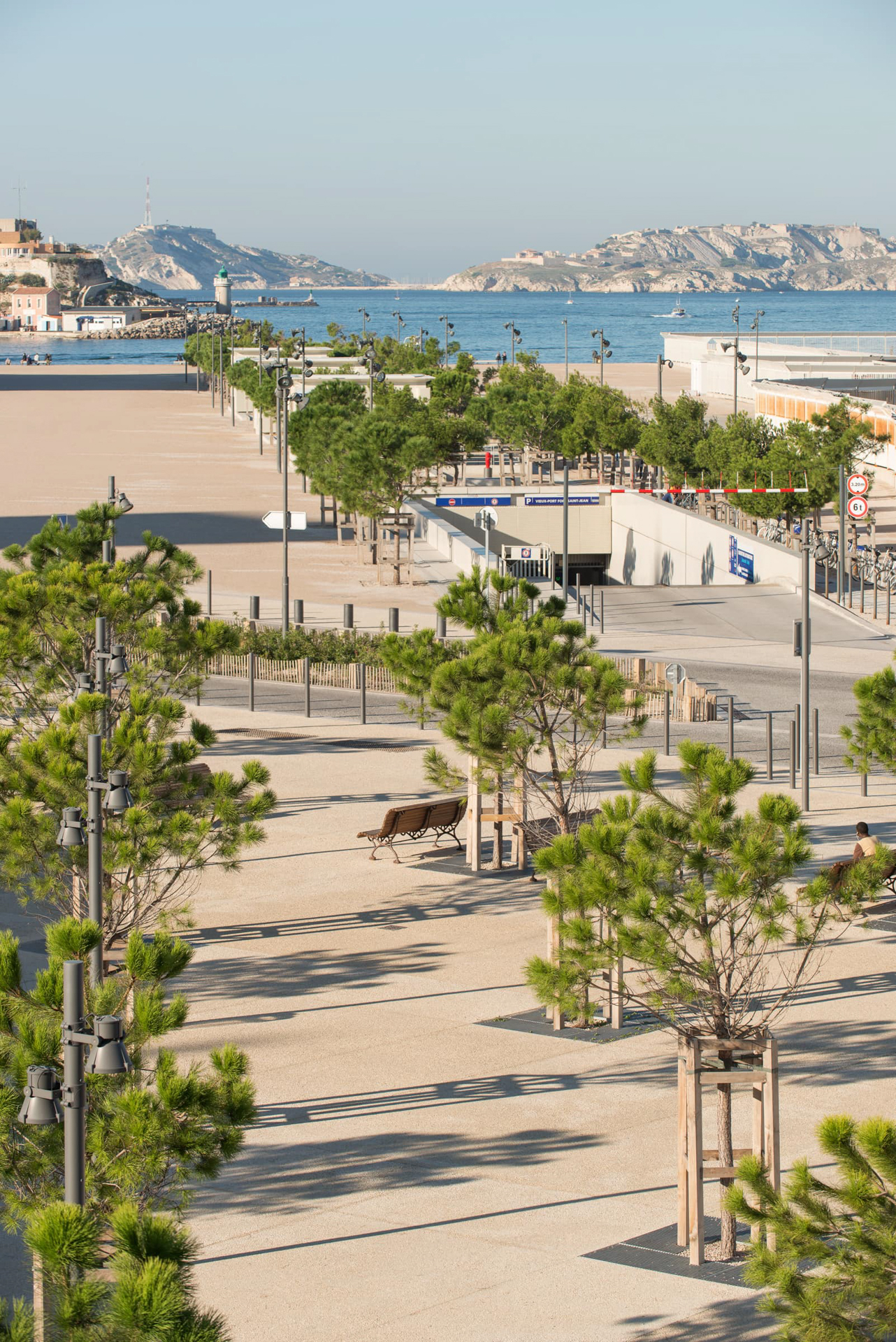 Reportage photo d’une vaste promenade urbaine imaginée par Ilex | paysage + urbanisme à Marseille : une liaison fluide entre la ville et la mer, des végétaux méditerranéens et un grand front de mer repensé.